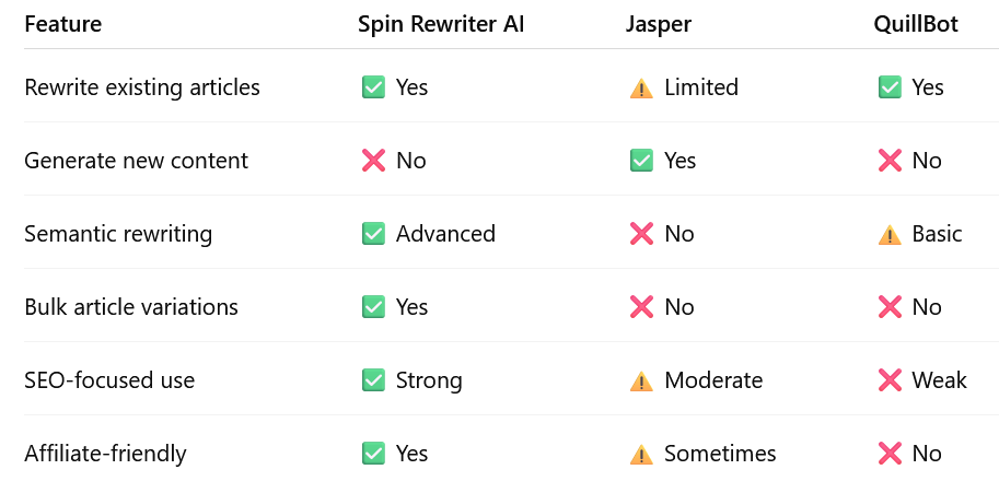In this comparison, we'll break down Spin Rewriter AI vs Jasper vs QuillBot, explaining what each tool does ideal and which one fits your web content objectives.